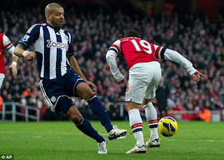 The match had its first goal in the 26th minute after a controversial penalty was awarded in Arsenal's favour after West Brom defender Steven Reid apparently tackled midfielder Santi Cazorla inside the box.