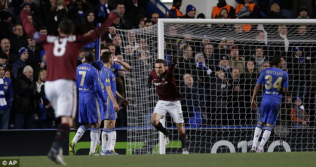 | Shock: Lafata celebrates his opener for Sparta Prague in the 17th minute. |